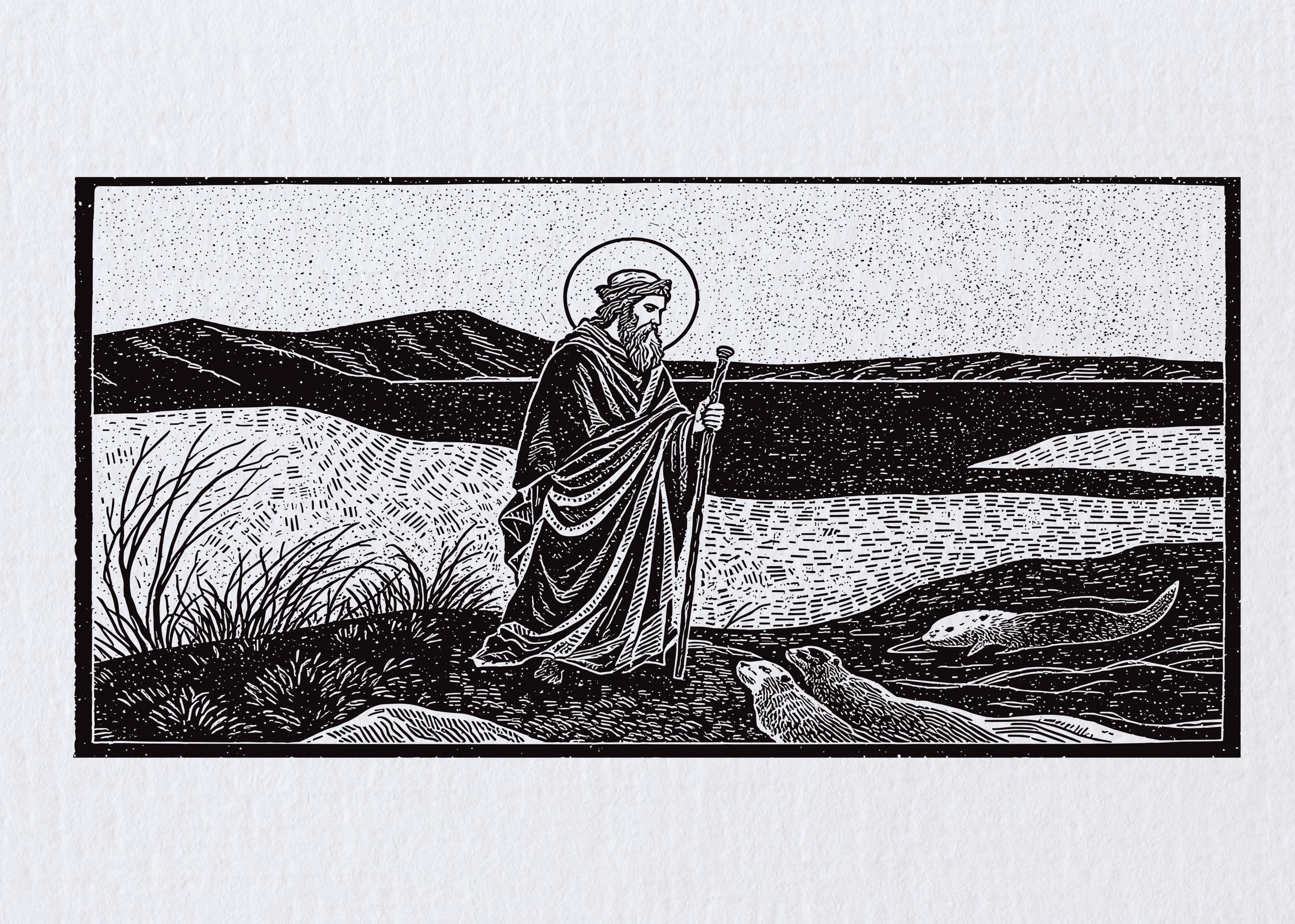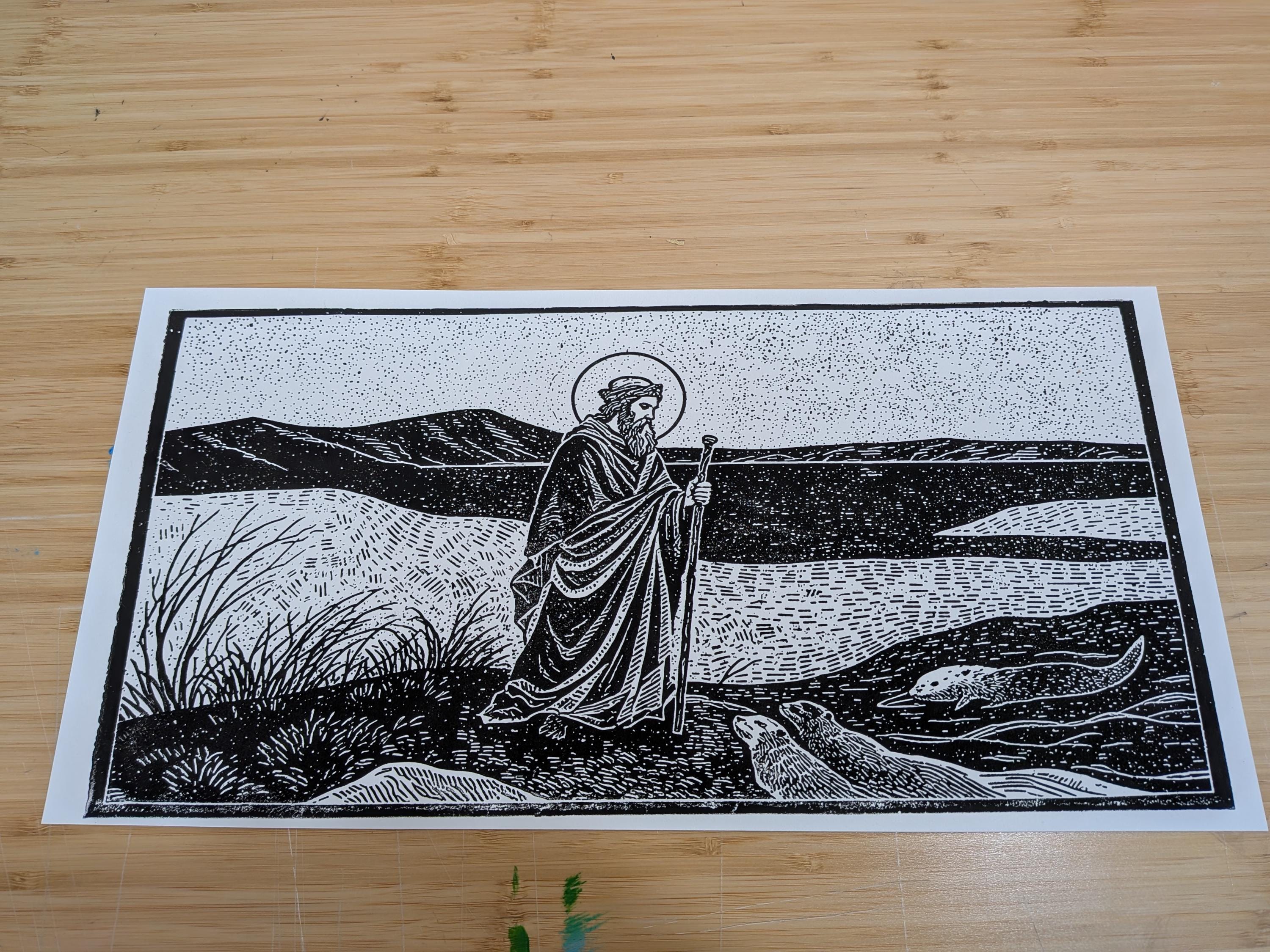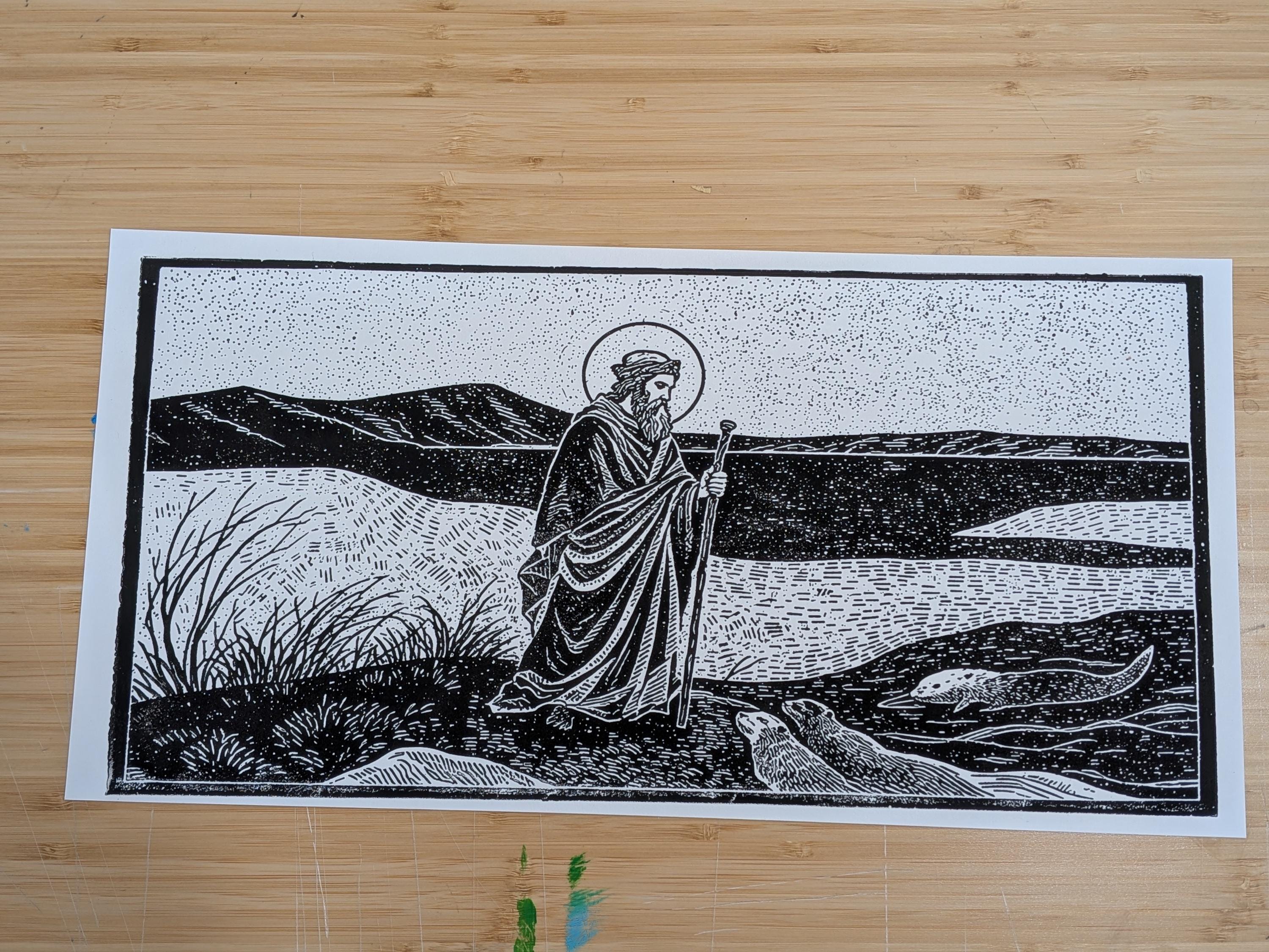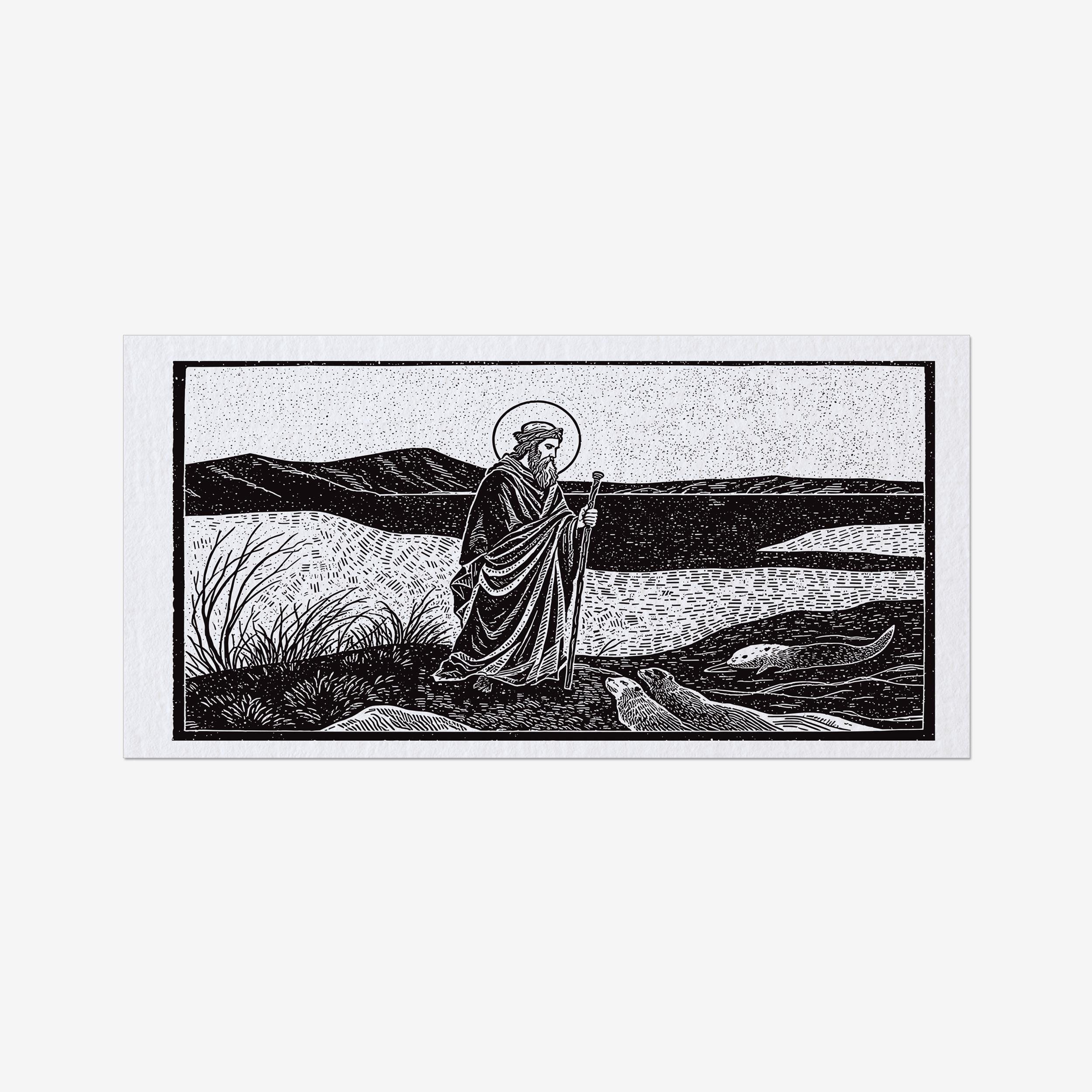 What makes Cuthbert particularly resonate with artists and nature-lovers today is his deep, legendary connection to the natural world. He was an early advocate for what we might now call wildlife conservation. Stories tell of him standing waist-deep in the freezing North Sea to pray, only to have a pair of otters emerge from the waves to warm his feet with their fur—a moment beautifully captured in this relief print. He even established some of the earliest bird protection laws on the Farne Islands to protect the Eider ducks, which are still known locally as "Cuddy’s Ducks."