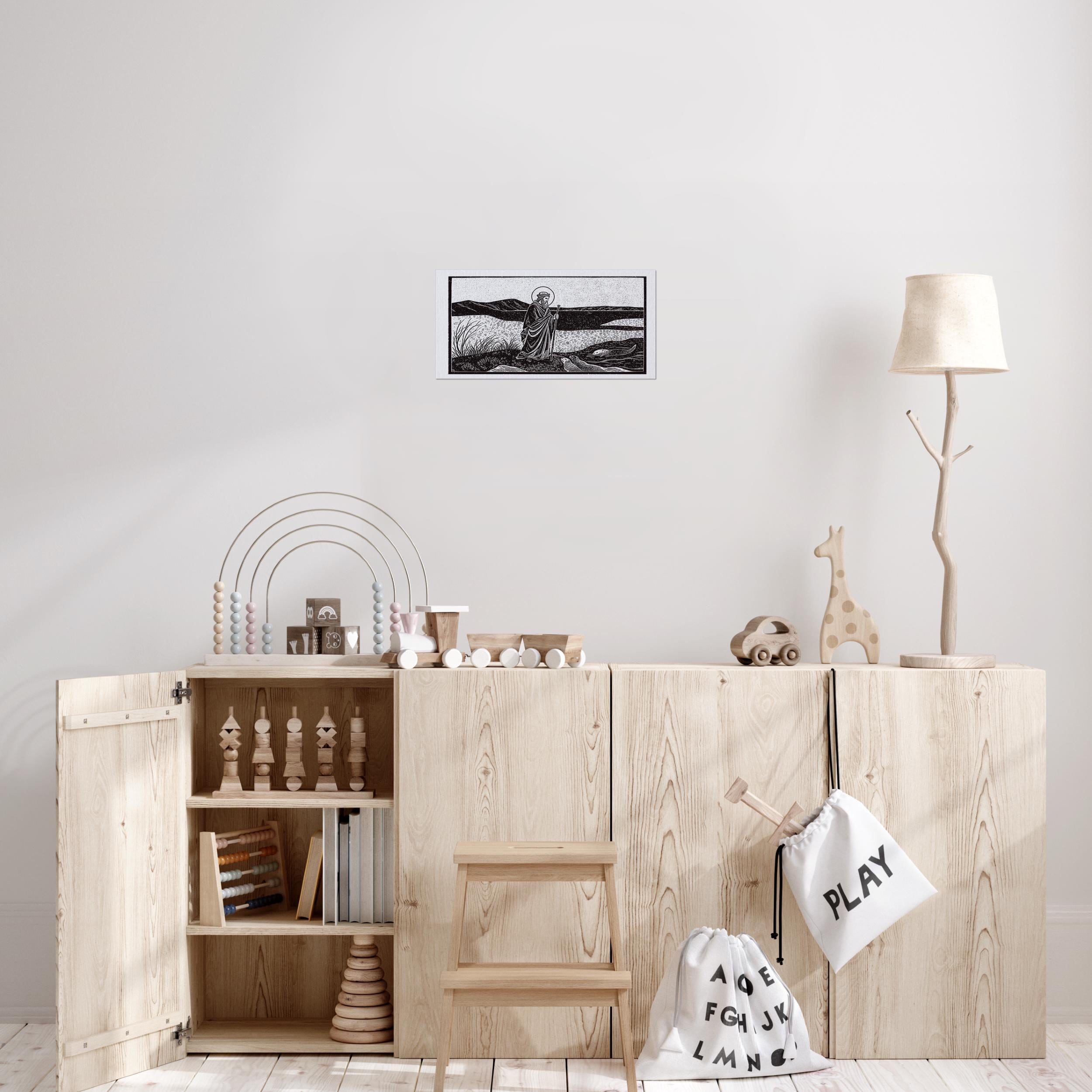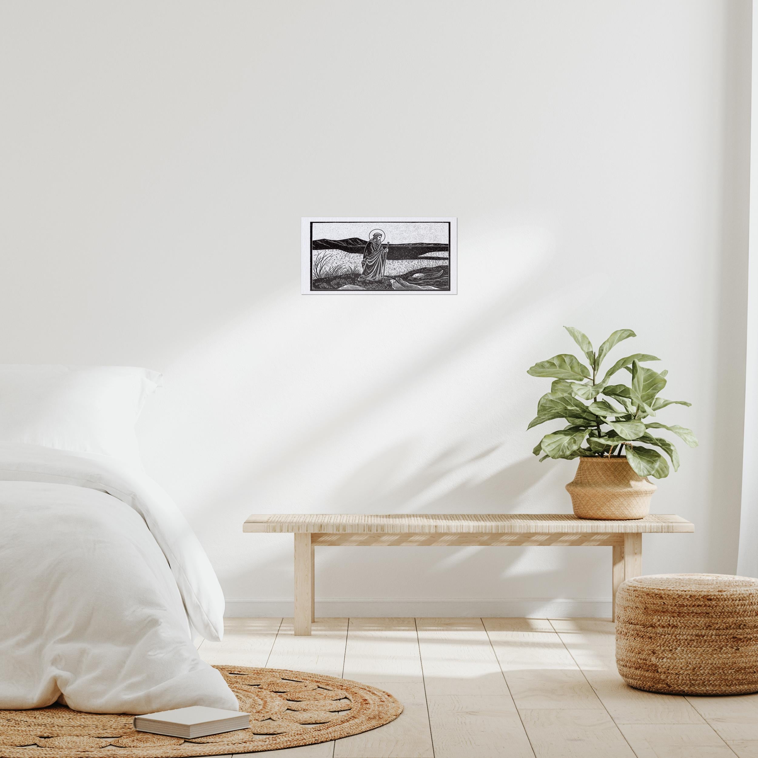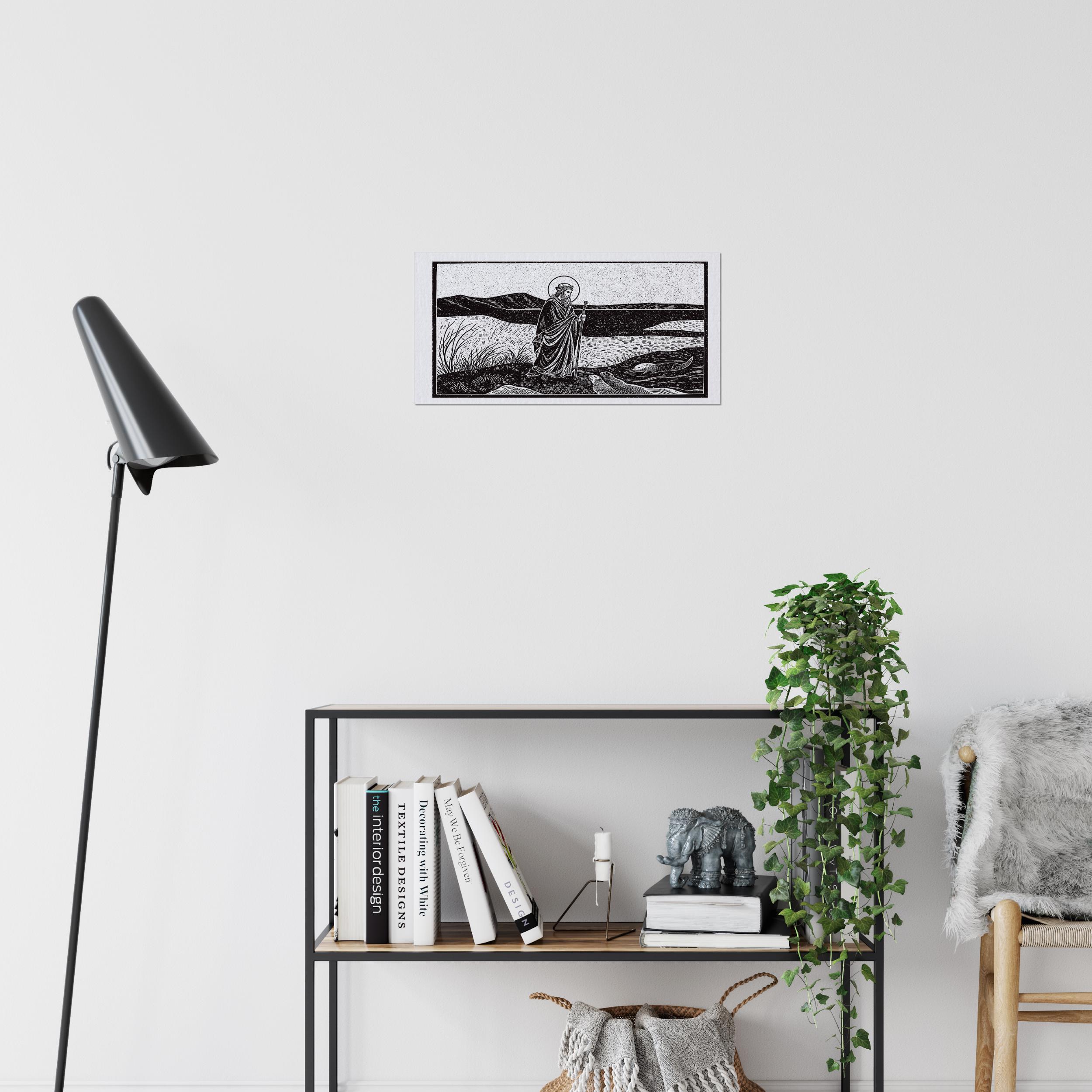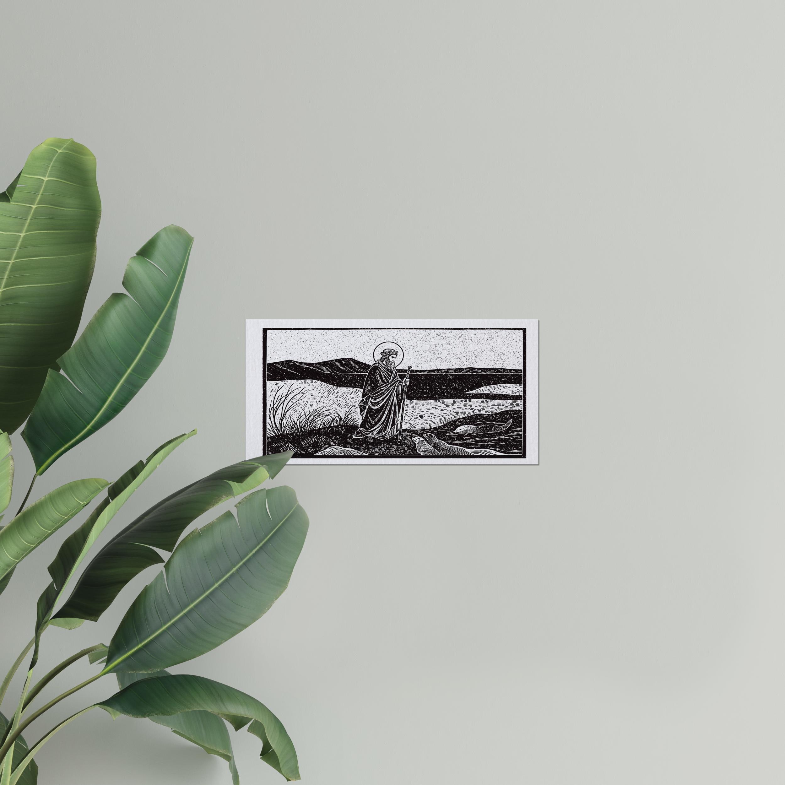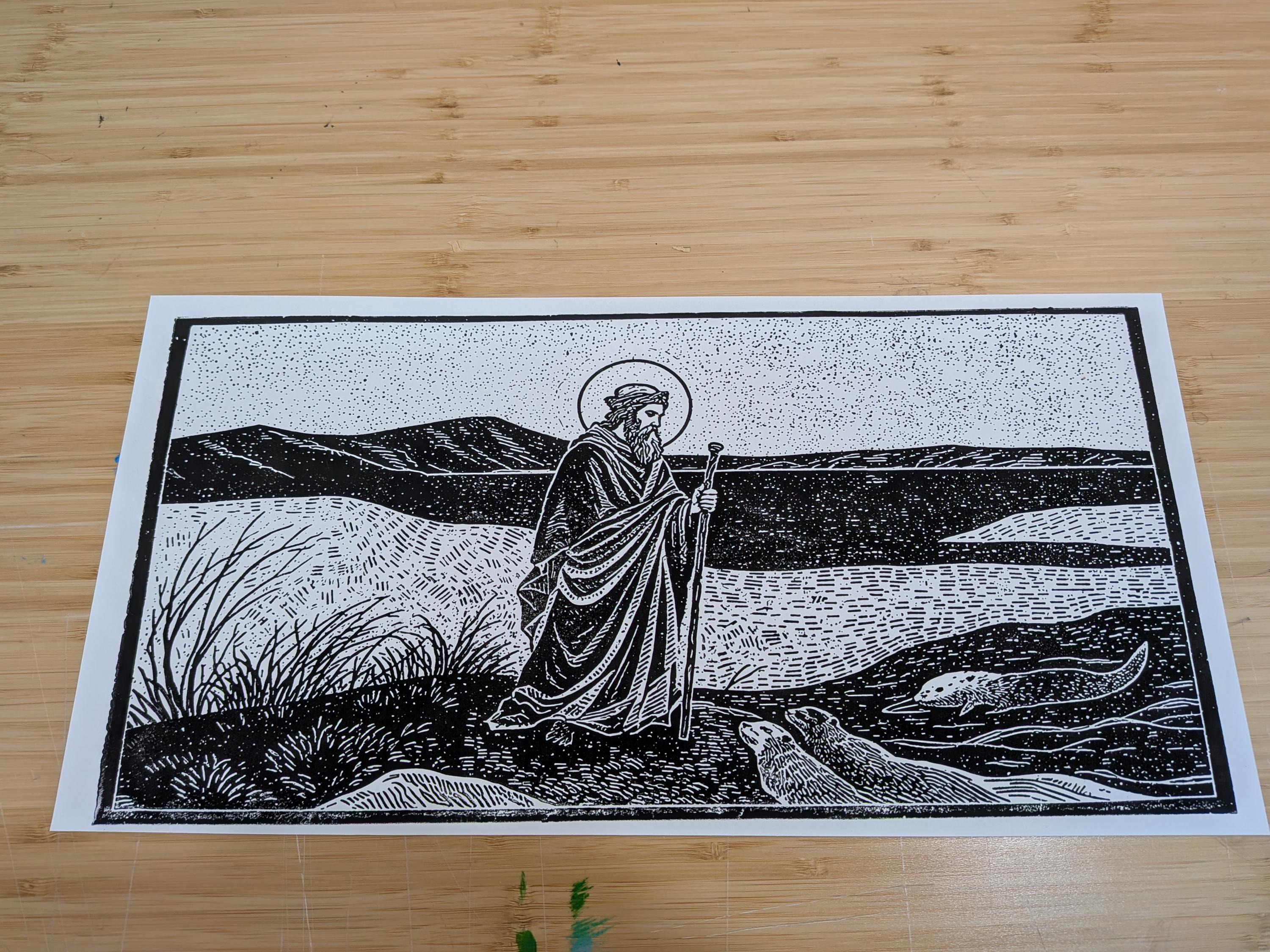 What makes Cuthbert particularly resonate with artists and nature-lovers today is his deep, legendary connection to the natural world. He was an early advocate for what we might now call wildlife conservation. Stories tell of him standing waist-deep in the freezing North Sea to pray, only to have a pair of otters emerge from the waves to warm his feet with their fur—a moment beautifully captured in this relief print. He even established some of the earliest bird protection laws on the Farne Islands to protect the Eider ducks, which are still known locally as "Cuddy’s Ducks."
