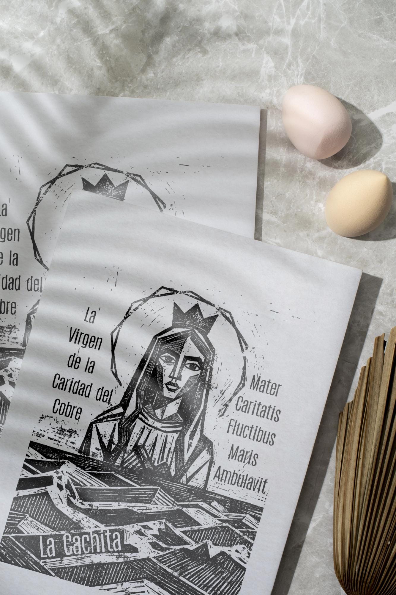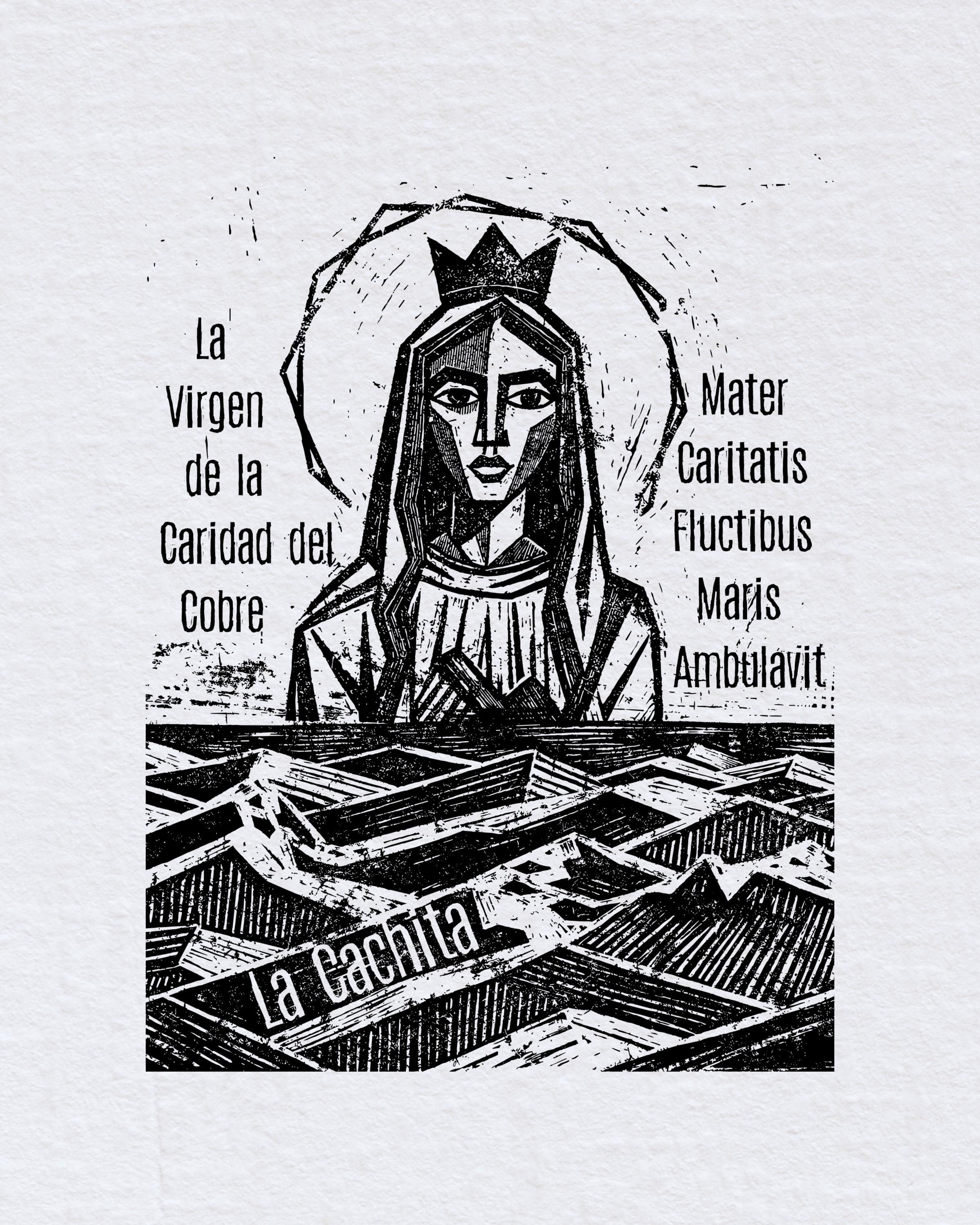 - Black and white relief print showcasing intricate details of the Virgin of La Caridad del Cobre