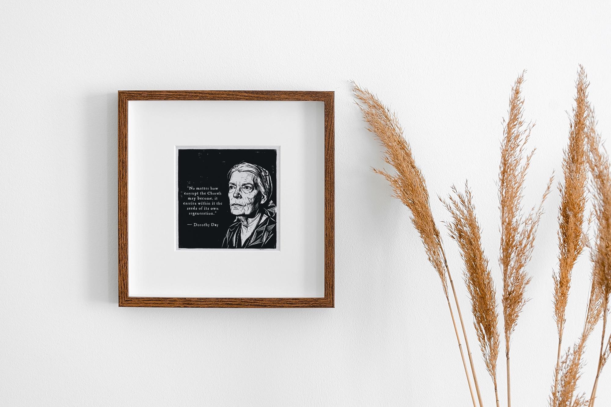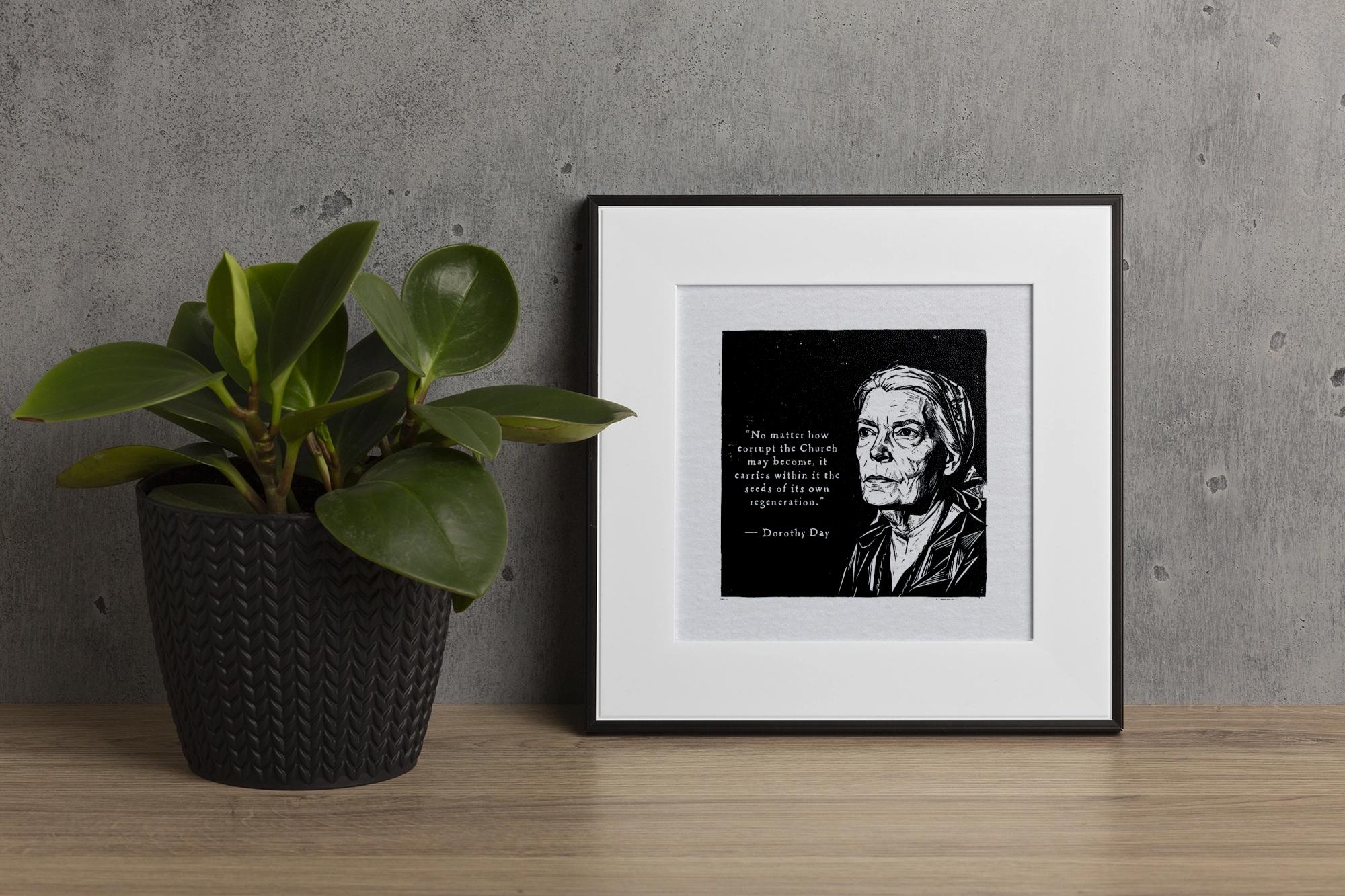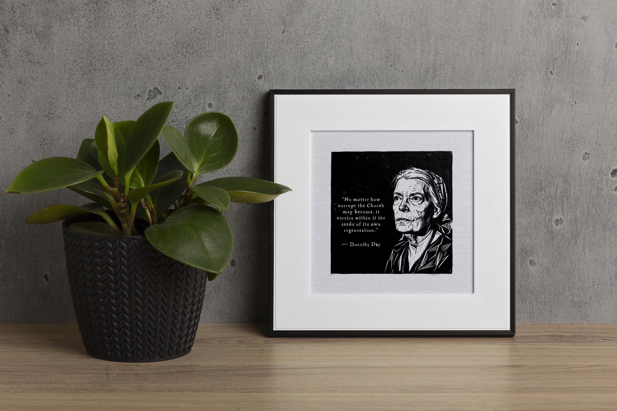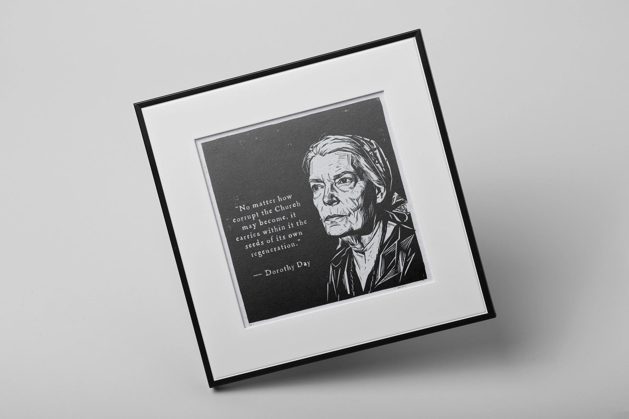 Dorothy Day Portrait and Quote About the Church, 6x6 inch Relief Print