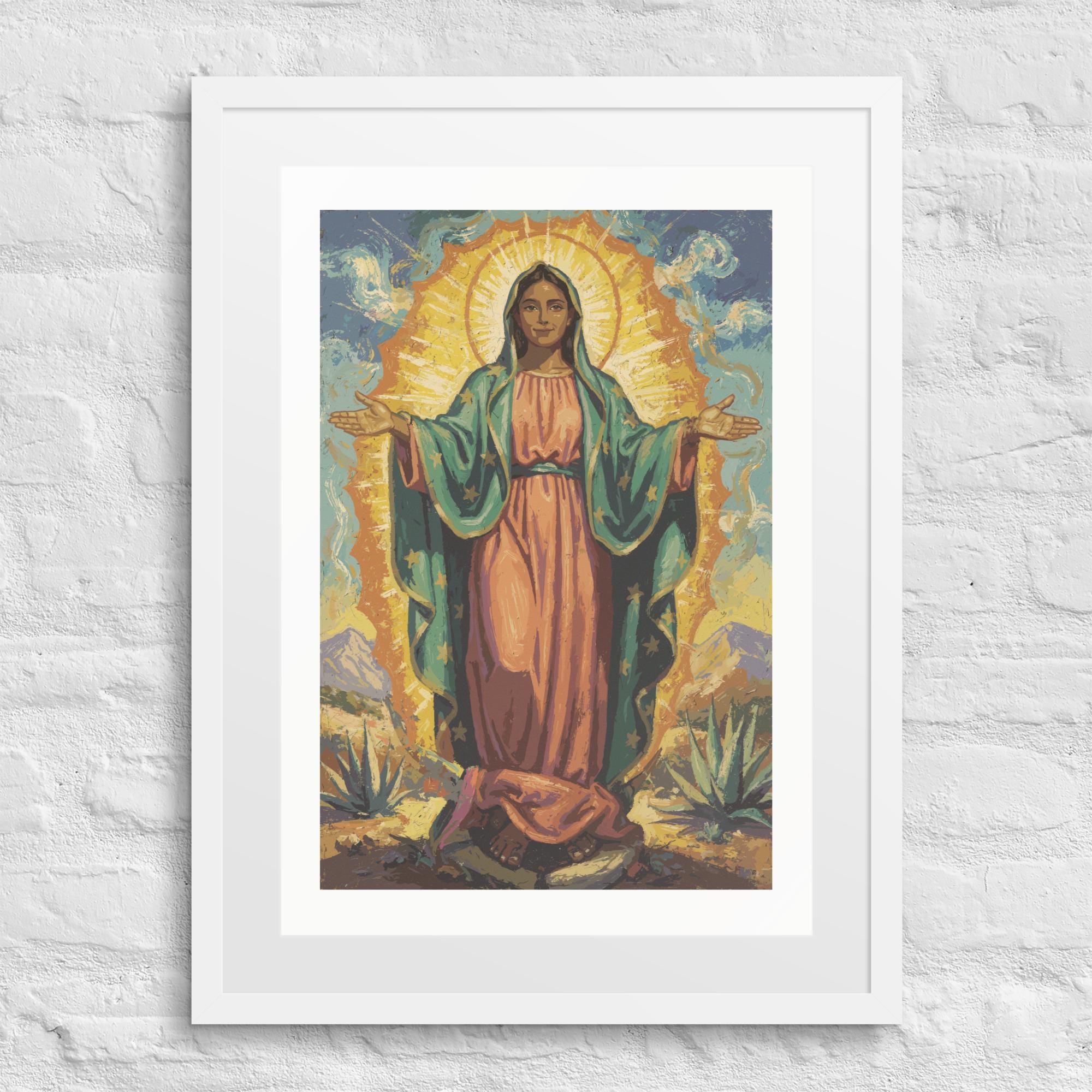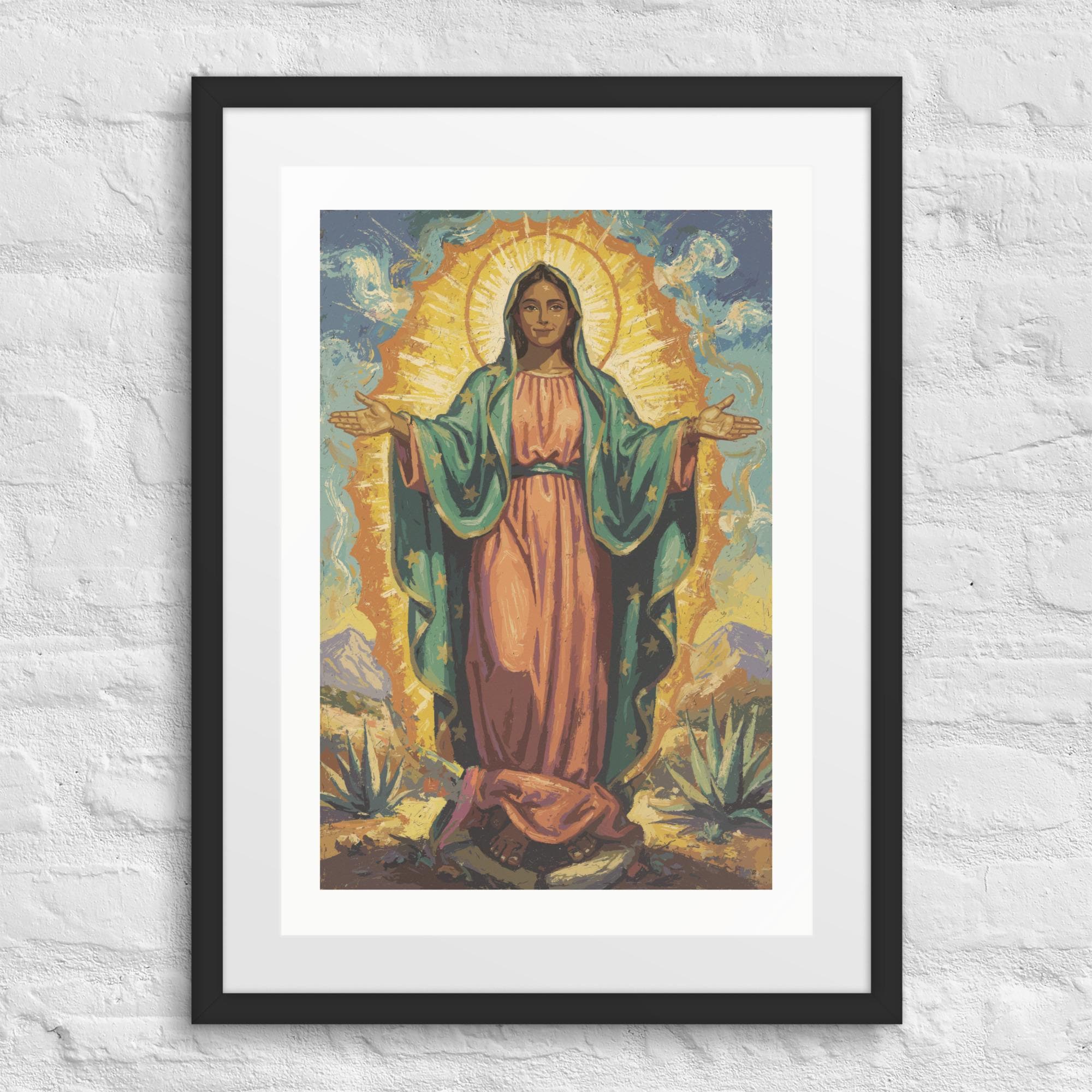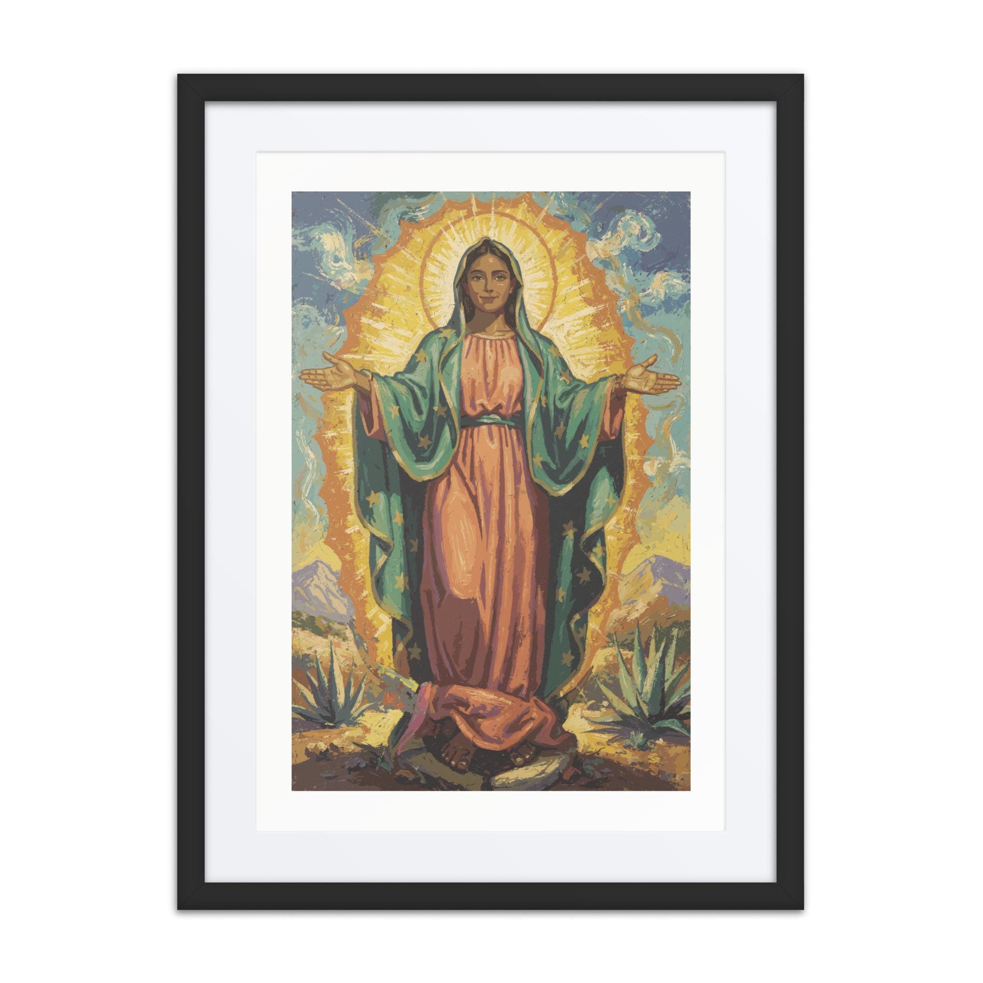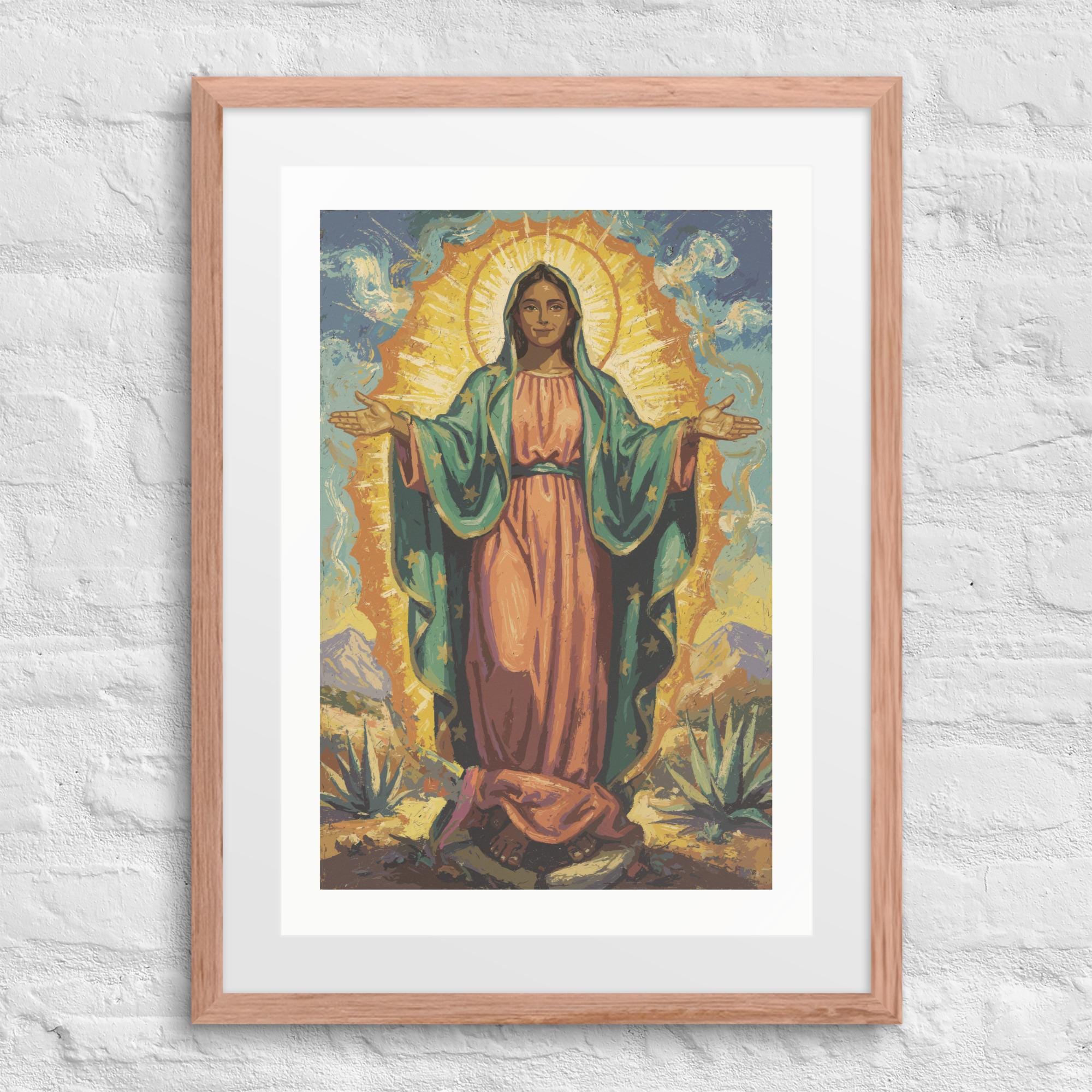 Beneath her, desert plants and agave anchor the scene to Tepeyac Hill, the site of the apparition and a place once associated with the Aztec mother goddess Tonantzin. This connection between the Virgin and Indigenous spirituality is central to her story—she became a bridge between cultures, a symbol of comfort, identity, and resilience for the people of Mexico.