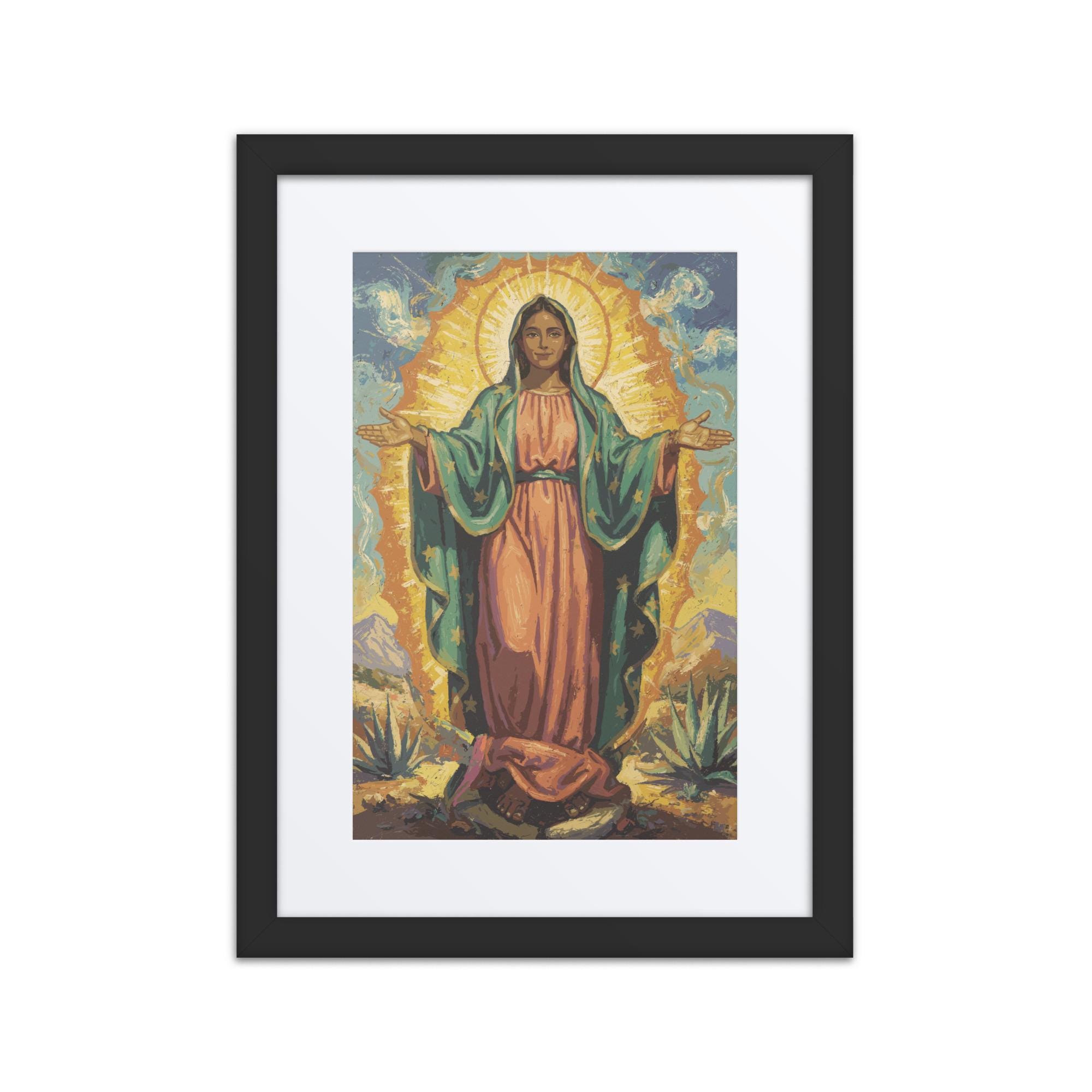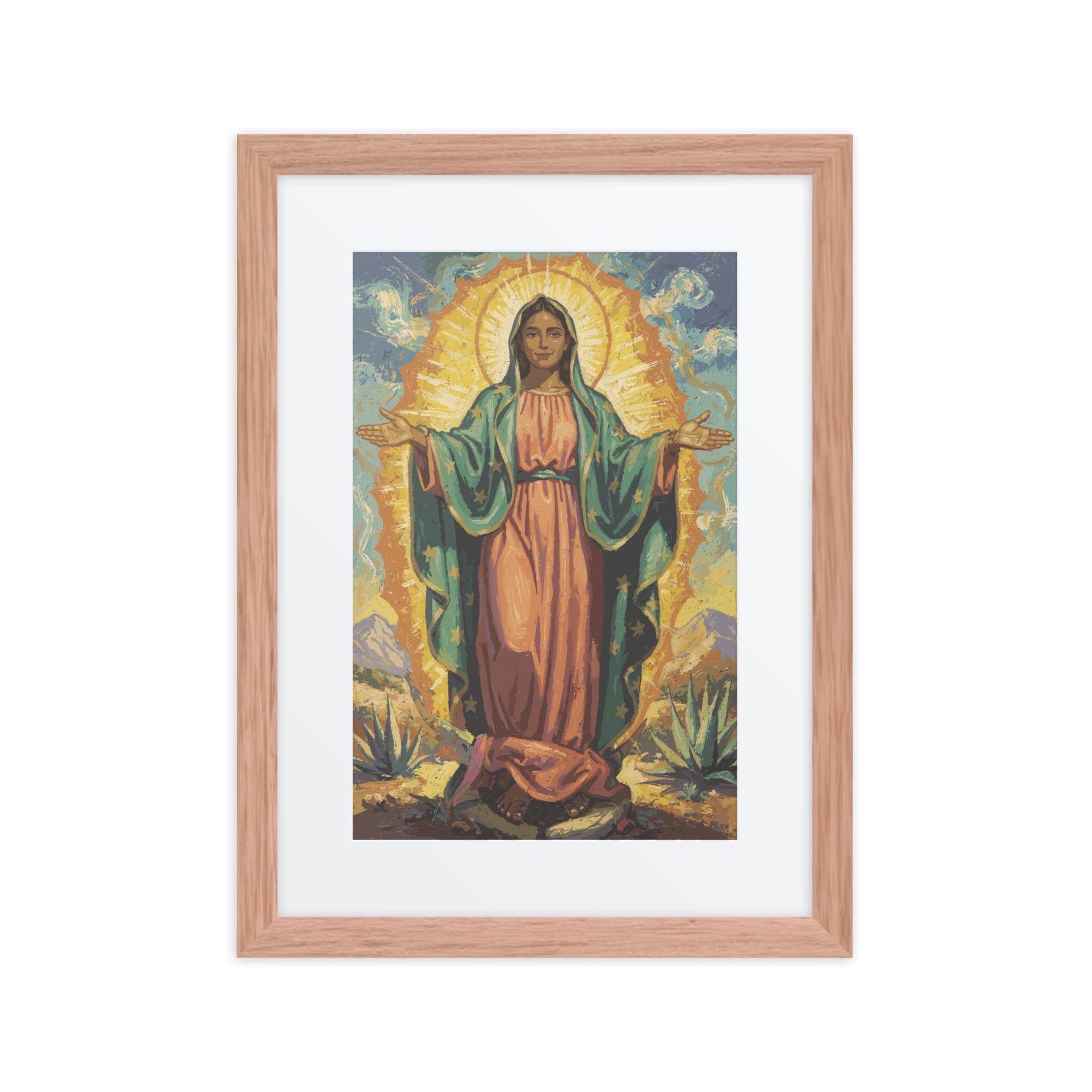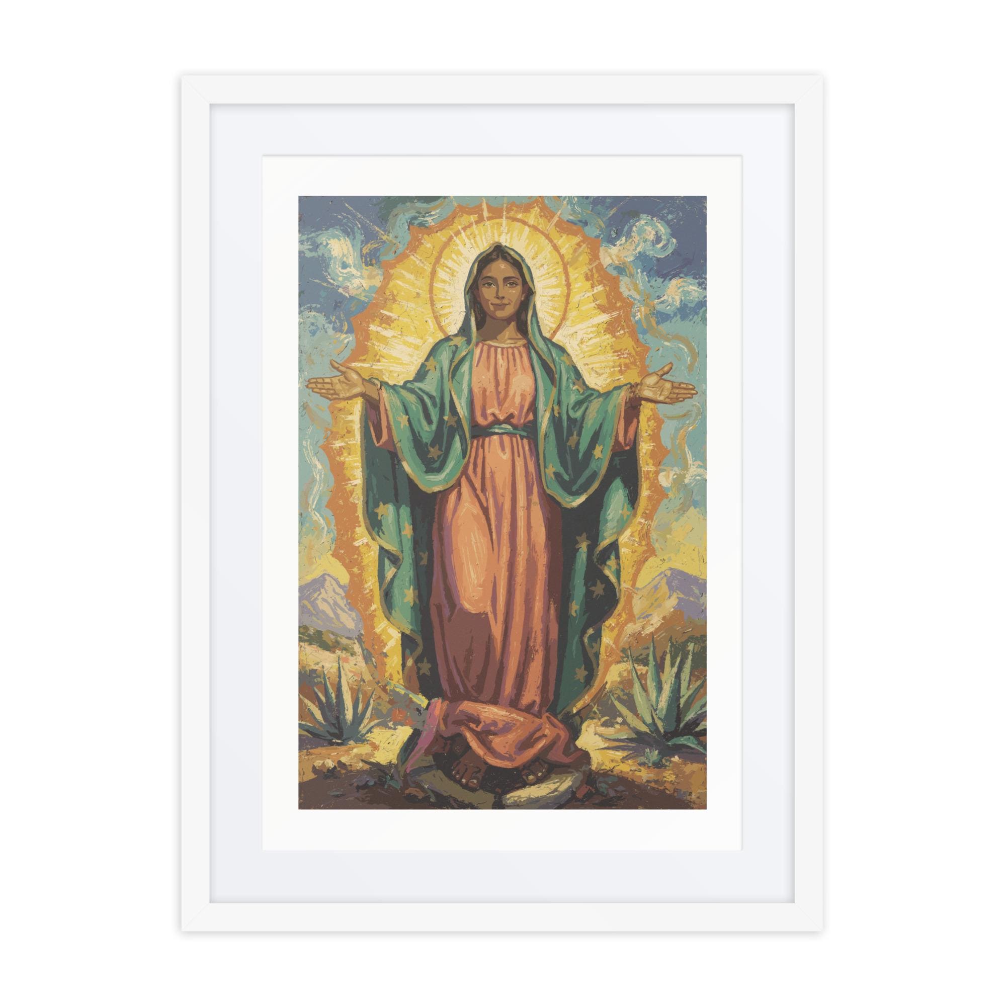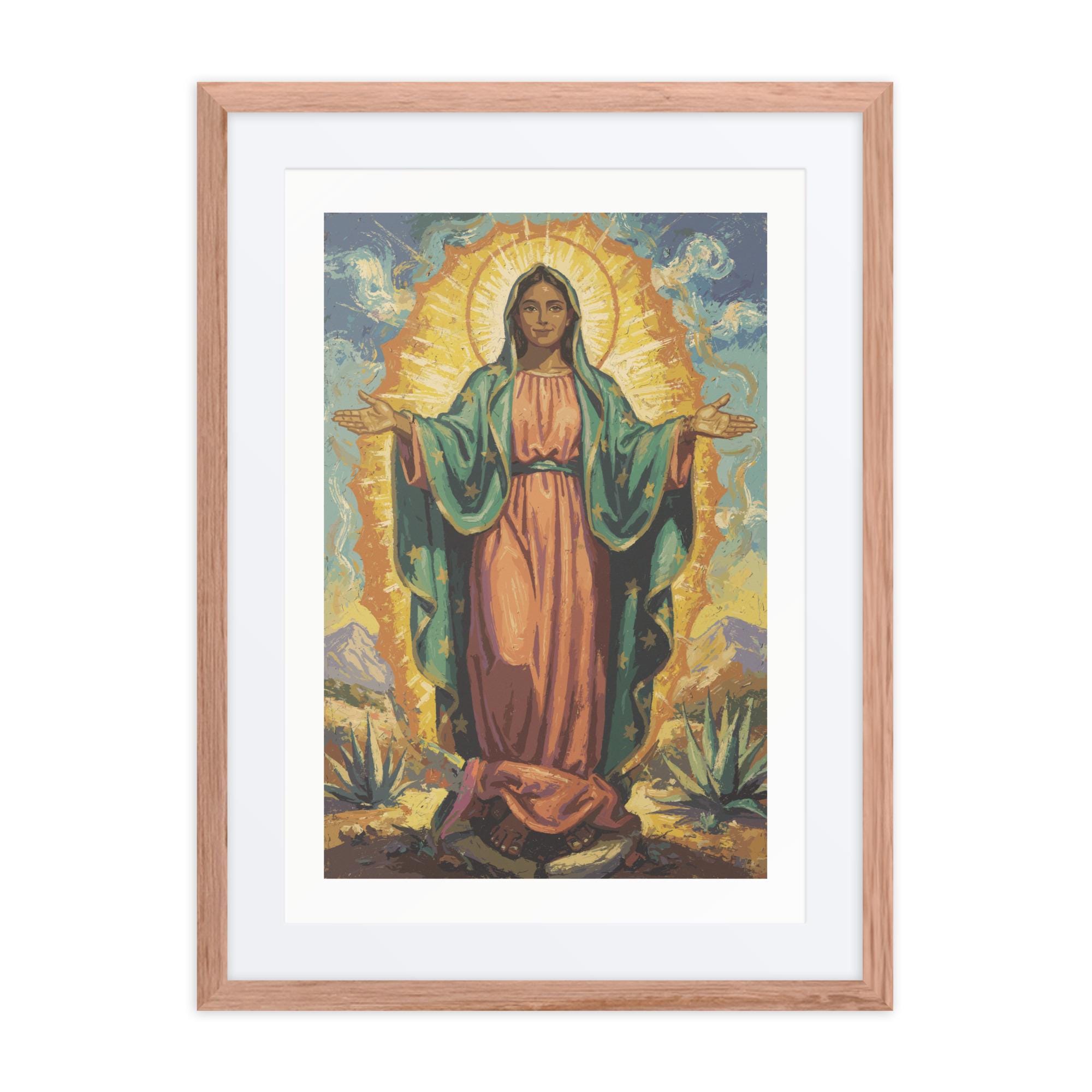 Beneath her, desert plants and agave anchor the scene to Tepeyac Hill, the site of the apparition and a place once associated with the Aztec mother goddess Tonantzin. This connection between the Virgin and Indigenous spirituality is central to her story—she became a bridge between cultures, a symbol of comfort, identity, and resilience for the people of Mexico.