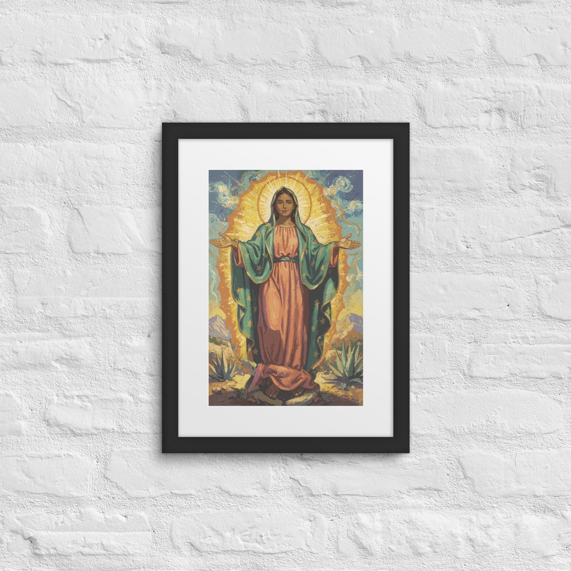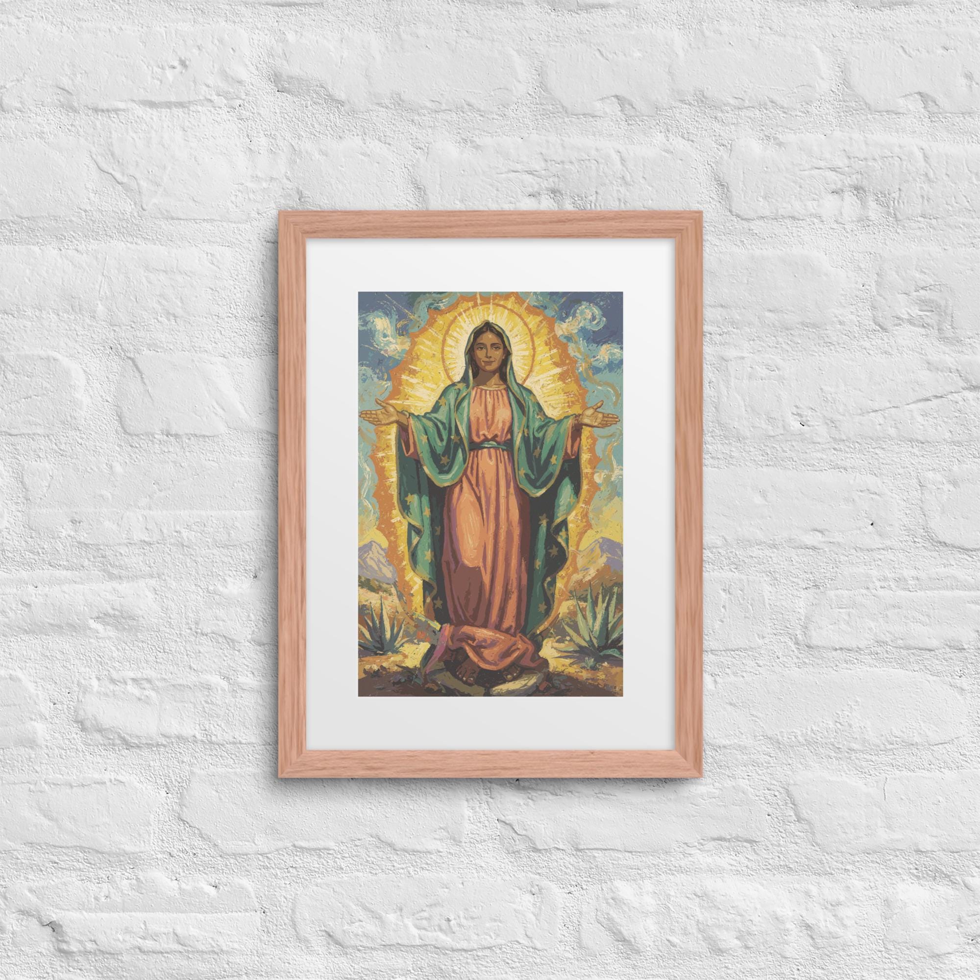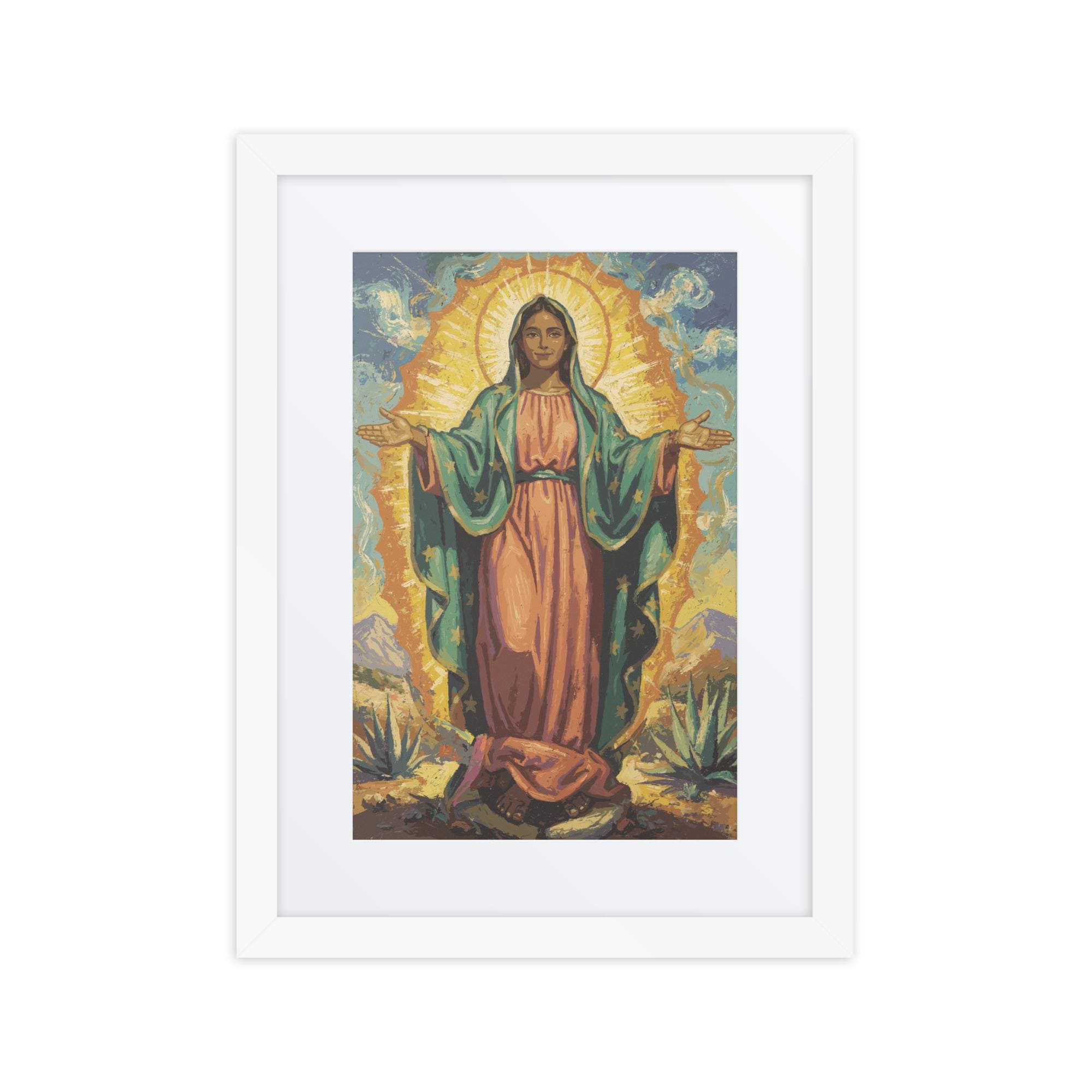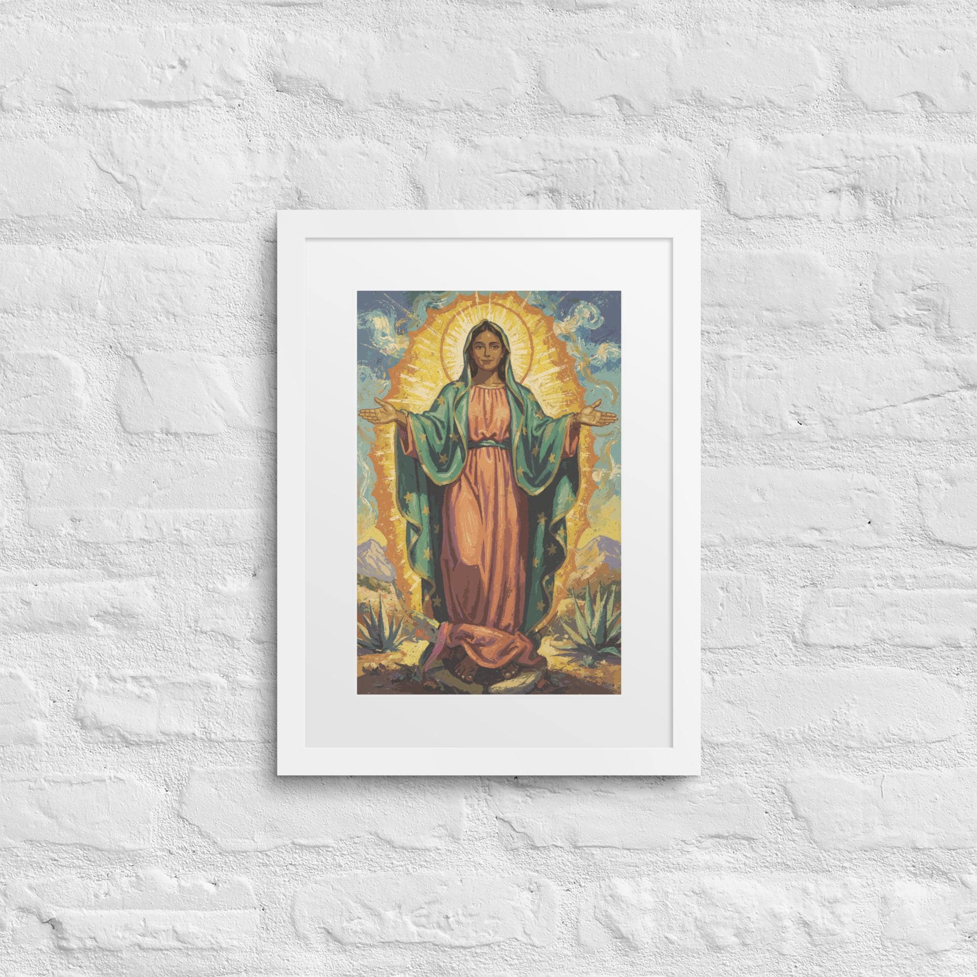 Beneath her, desert plants and agave anchor the scene to Tepeyac Hill, the site of the apparition and a place once associated with the Aztec mother goddess Tonantzin. This connection between the Virgin and Indigenous spirituality is central to her story—she became a bridge between cultures, a symbol of comfort, identity, and resilience for the people of Mexico.