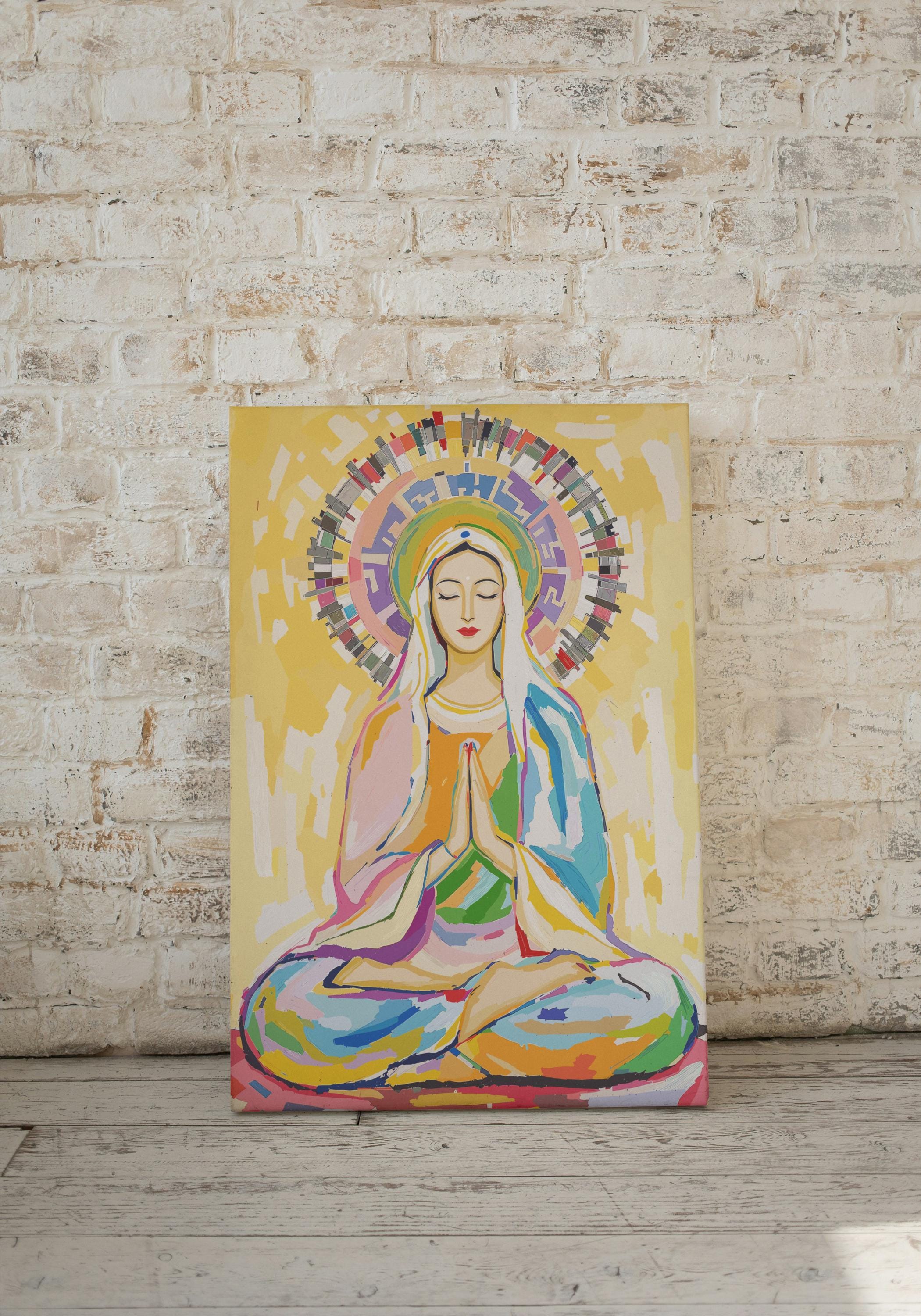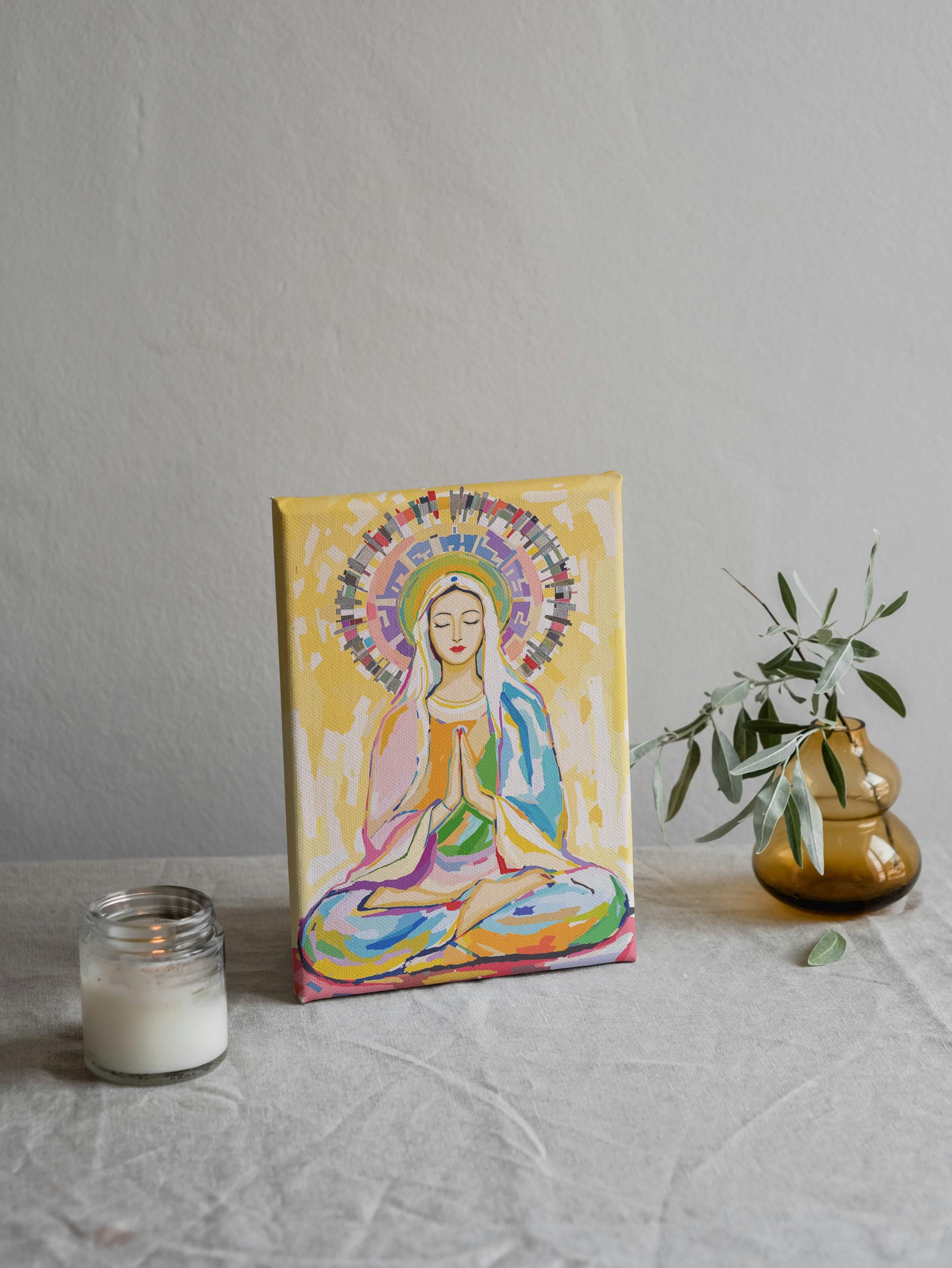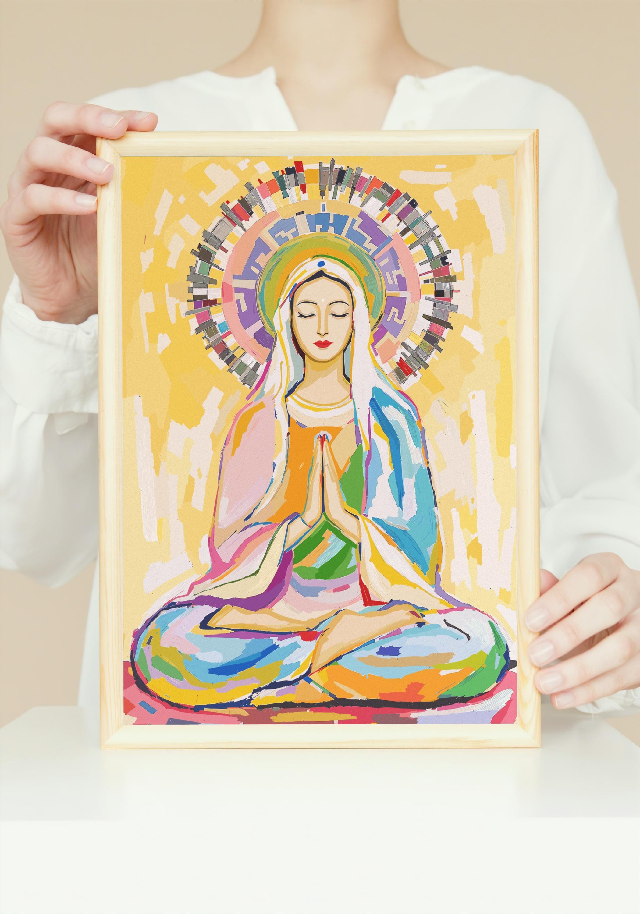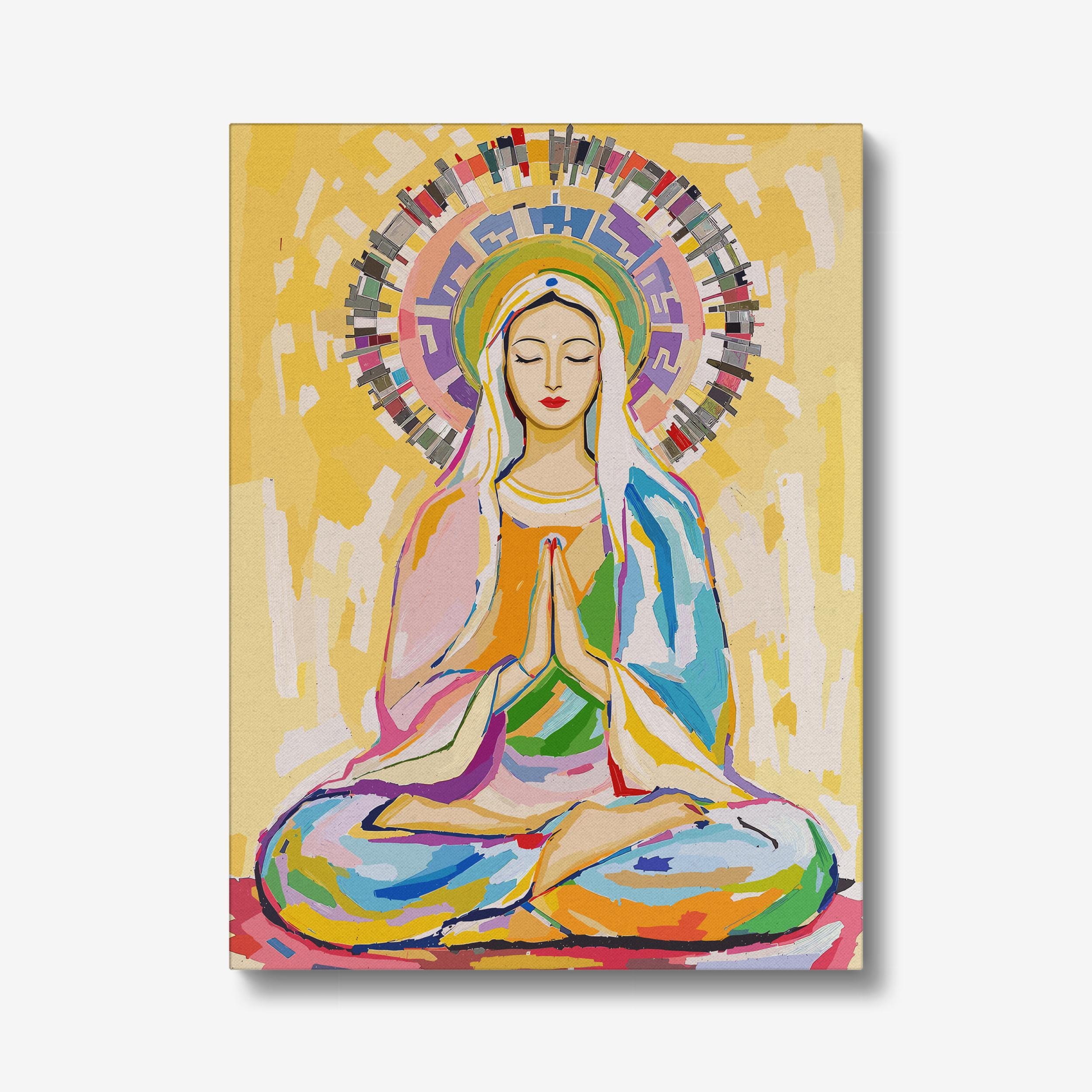 Crafted with vibrant, high-quality materials, this artwork captures Mary in a serene meditation pose, her hands gently pressed together in prayer and her eyes closed in peaceful contemplation. The radiant halo and colorful background symbolize spiritual awakening and universal love, making it a powerful piece for meditation spaces, spiritual centers, or as a meaningful gift for those who appreciate cross-cultural spirituality.