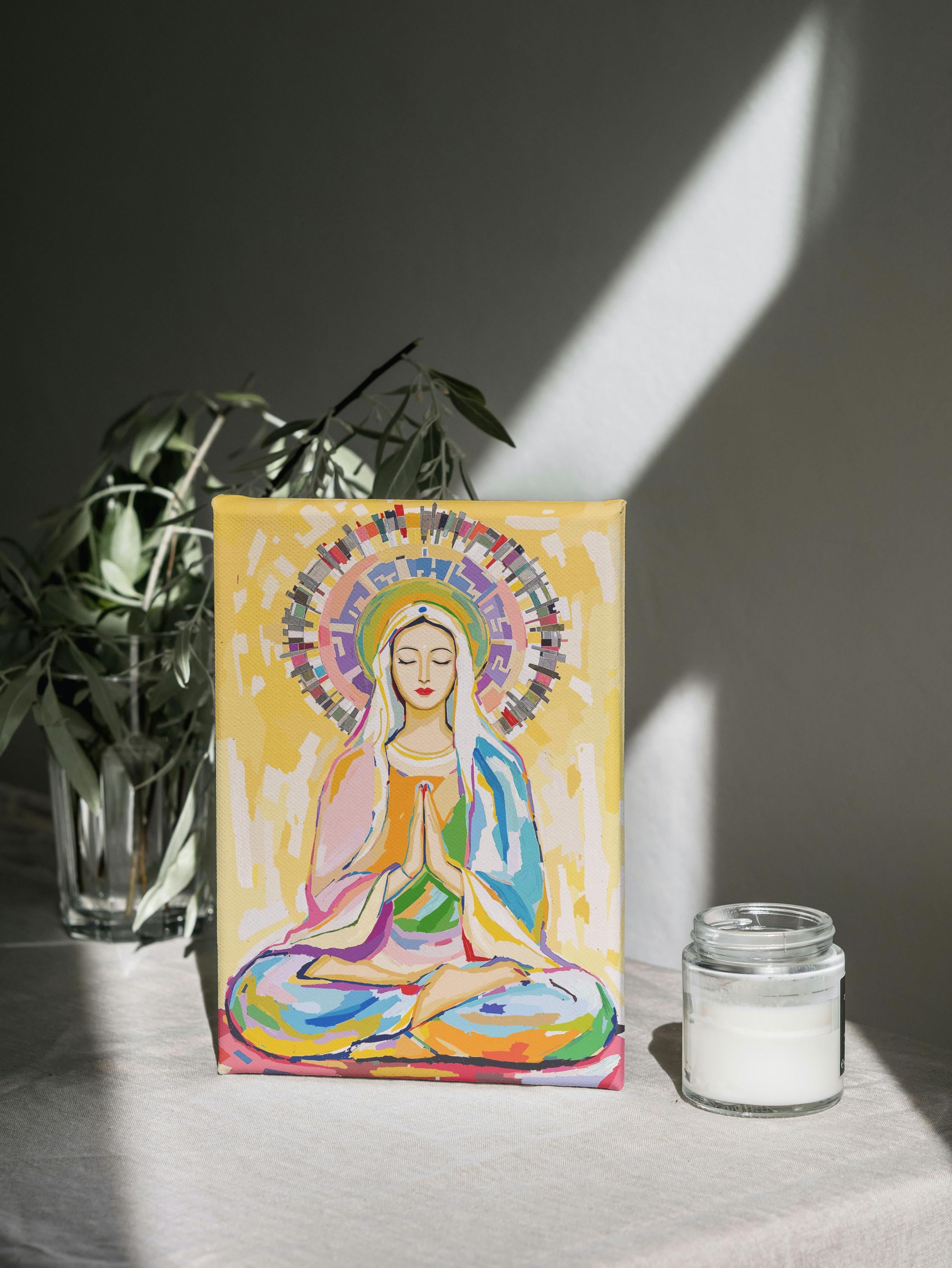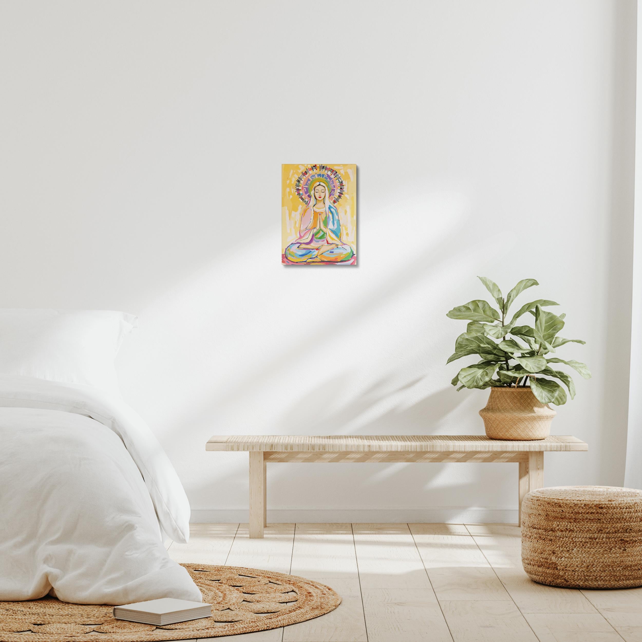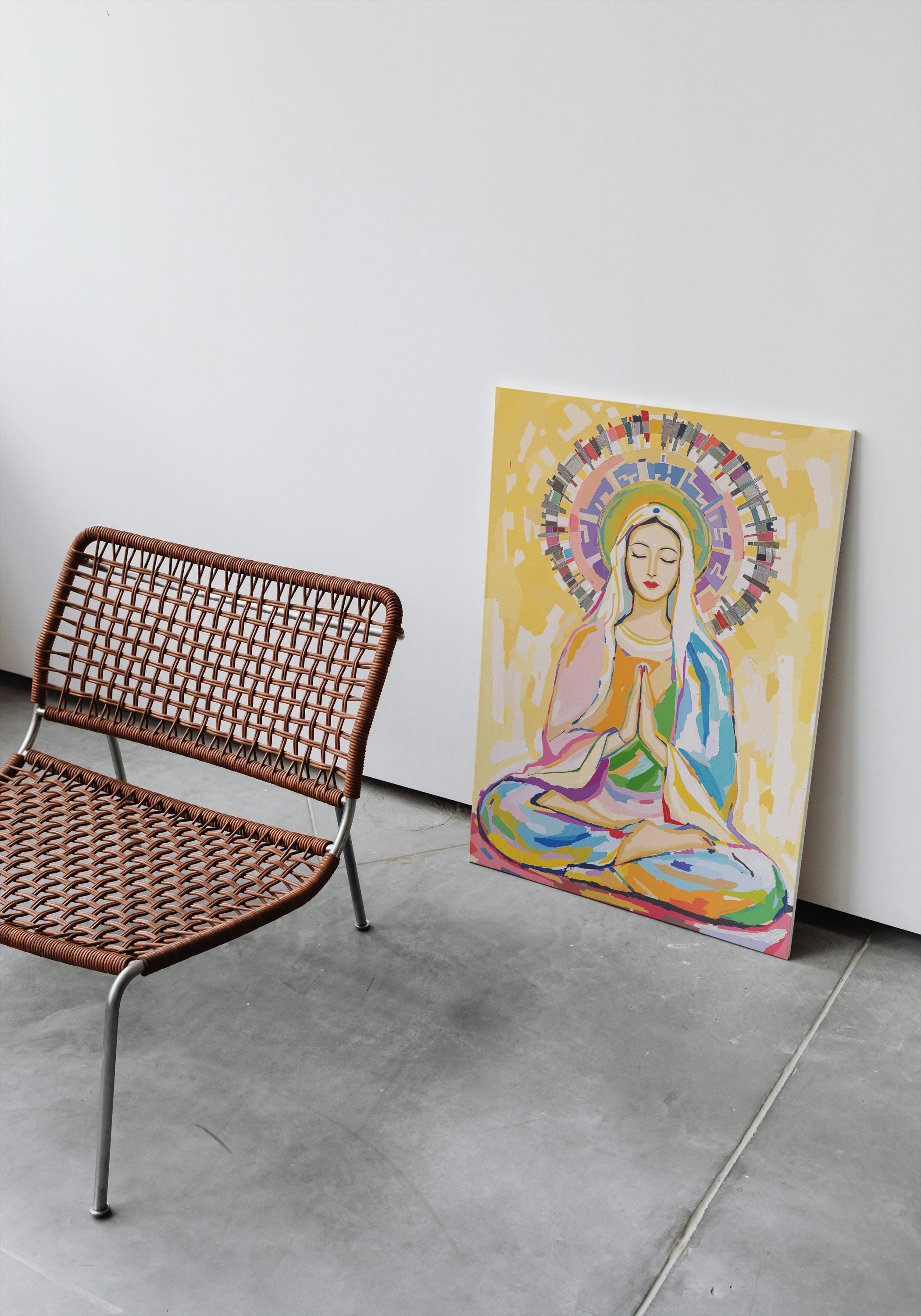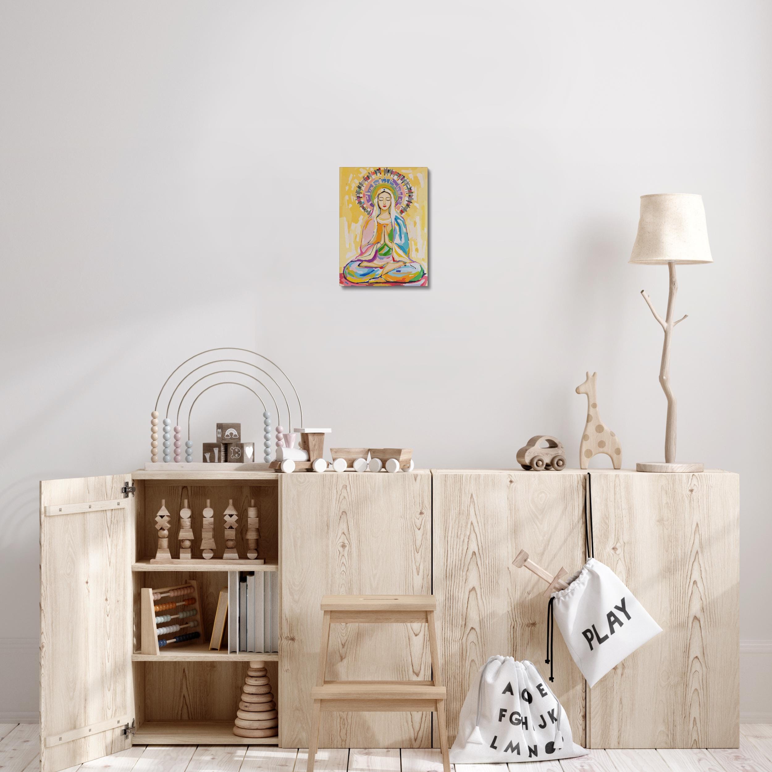 Crafted with vibrant, high-quality materials, this artwork captures Mary in a serene meditation pose, her hands gently pressed together in prayer and her eyes closed in peaceful contemplation. The radiant halo and colorful background symbolize spiritual awakening and universal love, making it a powerful piece for meditation spaces, spiritual centers, or as a meaningful gift for those who appreciate cross-cultural spirituality.