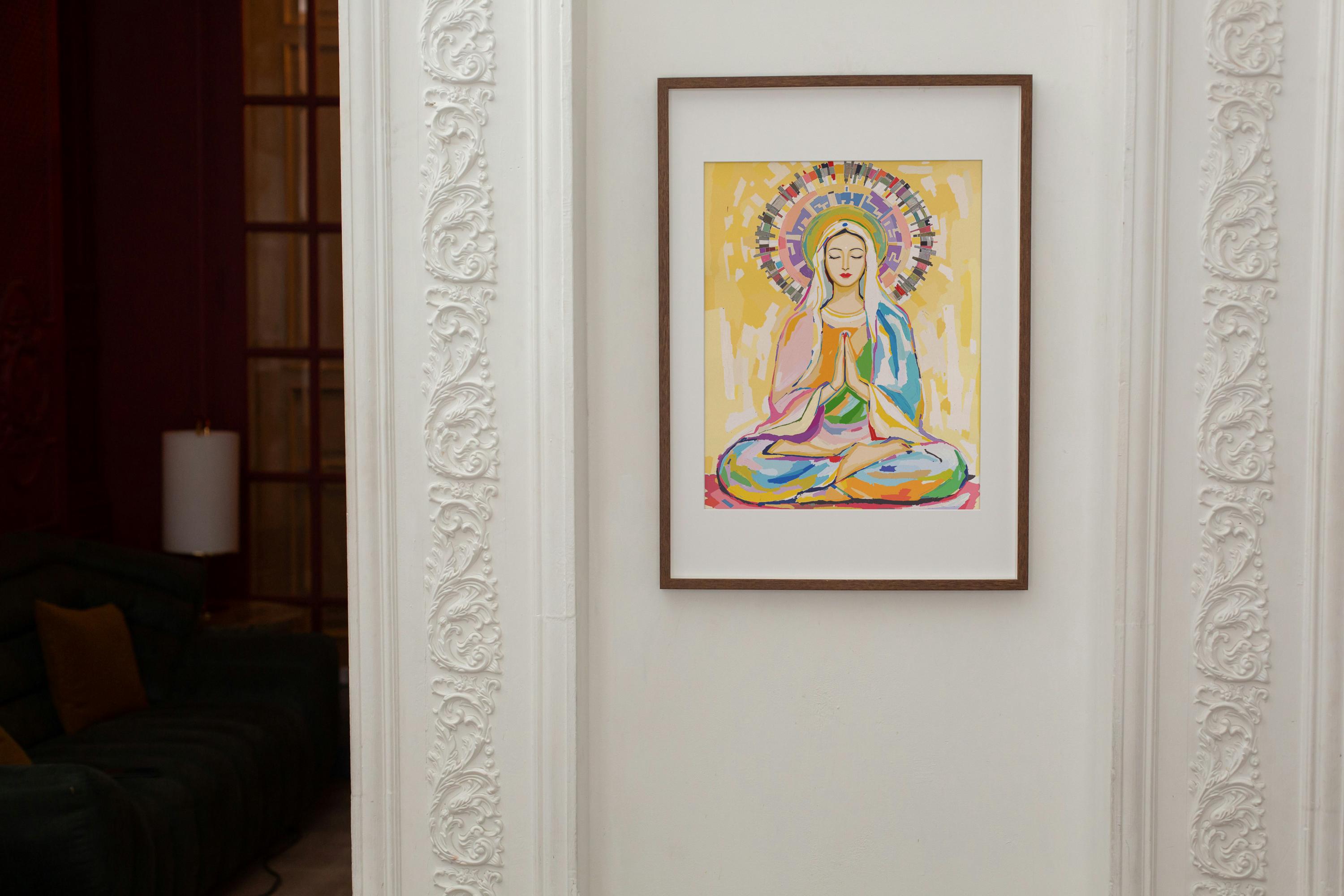 Discover the inspiring beauty of Mary, depicted as a Boddhisattva in Meditation, a captivating artwork that beautifully embodies universal themes of enlightenment, peace, and spiritual compassion. This unique piece elevates the traditional image of Mother Mary by portraying her as a Bodhisattva—a revered figure across various spiritual traditions—highlighting her capacity for compassion and enlightenment that transcends cultural boundaries.